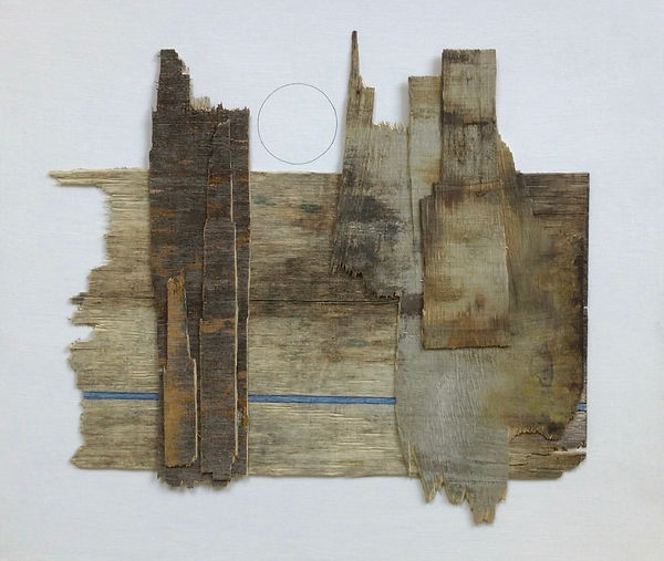 Rising Sun, London. Found wood collage, acrylic, pencil. Mounted on ply, 30.5 x 41 cm
